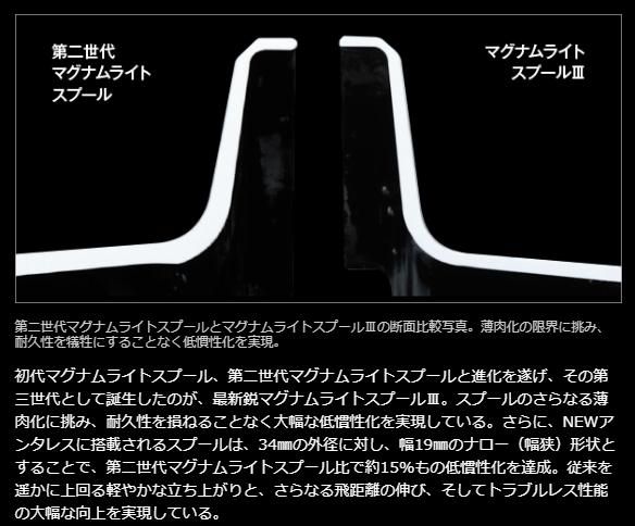 ■瞬時に回転が立ち上がり、どこまでも伸びる爽快なキャストフィールを実現する、最新鋭マグナムライトスプールIIIを搭載。サイレントチューンとS3Dスプールにより、スプール回転時の振動を徹底的に排除し、その性能を最大限発揮。低弾道キャストも意のままに決まります。左右非対称のアシンメトリーデザインを採用したコンパクトなフルメタルHAGANEボディは、高剛性化とともにパーミング時のフィット感も向上。さらに、シルキーな巻きごこちを実現するマイクロモジュールギアを搭載。幅広いウェイトに対応し、ショートキャストから遠投までこなせるバーサタイルモデルの最高峰です。