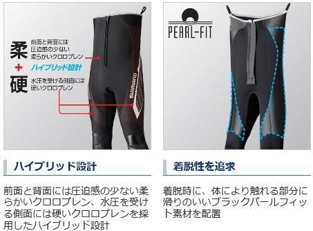 ●前面と背面には圧迫感の少ない柔らかいクロロプレン、水圧を受ける側面には硬いクロロプレンを採用したハイブリッド設計