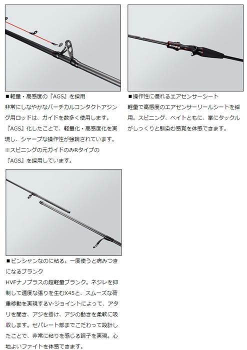 ■操作性と感度を追求した超軽量バーチカルコンタクトゲーム専用ロッド。軽量ブランクと『AGS』がハイレベルの操作性と感度を実現。調子を徹底追及したティップは、非常に小さなアタリや潮流の変化も感知すると同時に、絶妙な張りによって抜群の操作性をもたらし、攻撃的なアジングゲームを可能にしています。