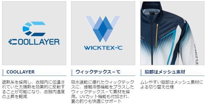 ●吸水速乾に優れたウィックテックスに、接触冷感機能をプラスしたウィックテックス−℃素材を採用。UVカット機能も付加され、夏の釣りも快適にサポート
