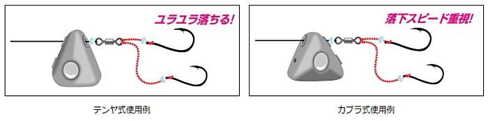 ■パイプは2個付きなので、ボトムが平らなテンヤ型でユラユラ落とすか、ボトムの水を切れが良いシャープなカブラでストレートに早く沈める。釣りの状況により、速やかに釣り方を変更可能。