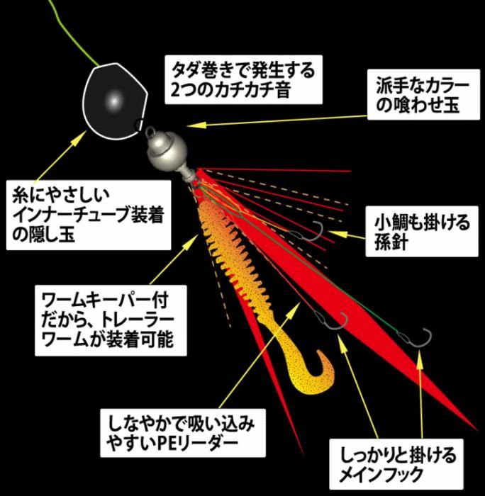 デビル渡辺考案 音でアピールする新発想タイラバ! 隠し玉と喰わせ玉の2つの分離式タイラバ。小さい喰わせ玉が、水流でアクションし、音や派手な色合いで喰い気を誘う新しいタイプのタイラバです。