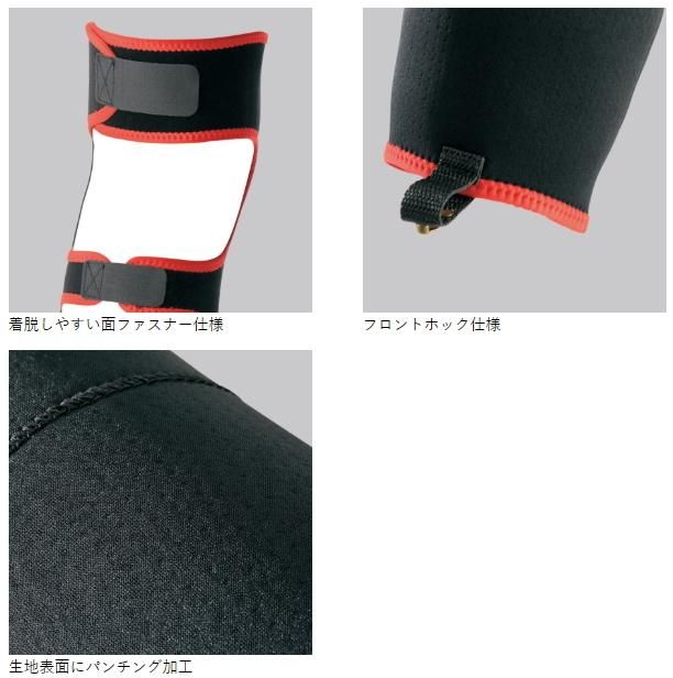 ●膝部分には地面への接地の際に、膝と本体をガードするための補強生地を取り付けたクロロプレンラバーを配置。