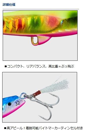 リアフックのリングには着脱可能なティンセルパーツが付属。アピールも高く、ジグの暴れすぎも抑制。ニゴリ、マズメ時のアピール向上。バイトマーカーの役割も果たし、フッキング率のアップにつなげます。