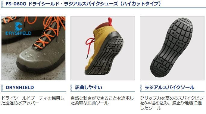 商品情報シマノ (SHIMANO) ドライシールド ラジアルスパイクシューズ(ハイカット) FS-060Q 磯靴 波止 防波堤 フィッシングシューズ