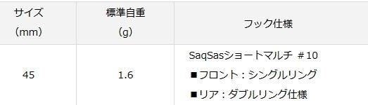 45mmサイズながらボディデザインとそのシルエットに沿ったリップにより圧倒的なキャストフィールで守備範囲は広く、ワイドポンドでも不足を感じさせない飛距離が出せる。カラーラインナップは全8タイプ。クリアウォーターからマッディウォーターまでをカバーしてくれるカラーバリエーションになっている。