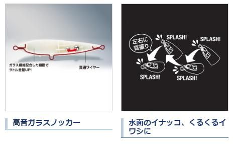 ●水面をピチャピチャ泳ぐ涸沼のイナッコや各地で発生するくるくるイワシ。このパターンの攻略を中心に設計しなおしたガラスライド95Fは、浮き角度を立ち気味に設定しピチャ!ピチャ!というスプラッシュを上げながら首を振るドッグウォークに設定。