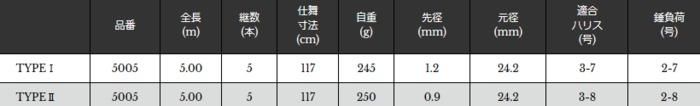 「V2 TYPEI」…離島の沖磯での60cmオーバーの尾長グレに照準を合わせつつ、地磯での中型尾長グレの釣りも意識したオールラウンダー。パワフルさの中にもしっかりした張りを保ち、操作性を高めるために軽さも意識した設計。穂先には激流並の早い潮を釣る事に照準を合わせて設計した中空タイプを採用。(2.5号程度)