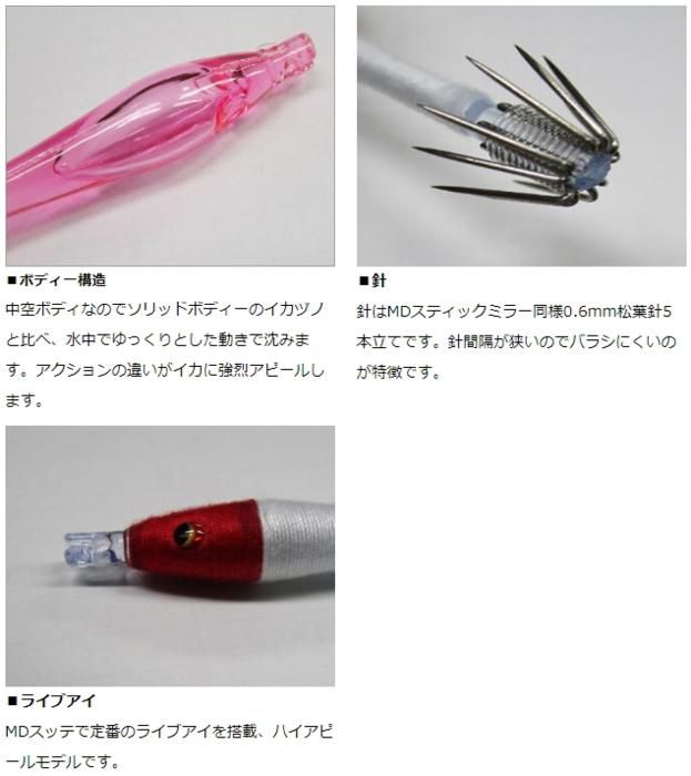■針は0.6mm松葉針5本立て(MDスティックシリーズと同じ)。 アイはMDスッテでおなじみのライブアイを使用しています。