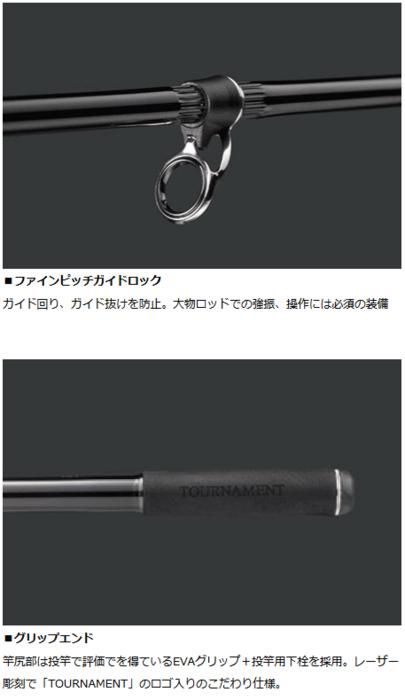 ダイワ DAIWA グローブライド トーナメント ISO 遠投 TOURNAMENT ISO ENTO カゴ遠投 磯竿 「トーナメント磯」シリーズに待望の遠投モデル登場 ■よりシャープに粘り強く生まれ変わったブランクス ■#1・2にファインピッチガイドロック搭載 ■トラブルレスな遊動Kガイドを採用 ■大型リールも保持抜群。スーパーフィットパイプシート ■遠投性にこだわった。EVAグリップ + 投竿用下栓 ■感性領域設計システム「ESS=Expert Sense Simulation」 ■SVFナノプラス ■X45 ■V-ジョイント ■ファインピッチガイドロック+SiC遊動Kガイド ■発売年:2017年