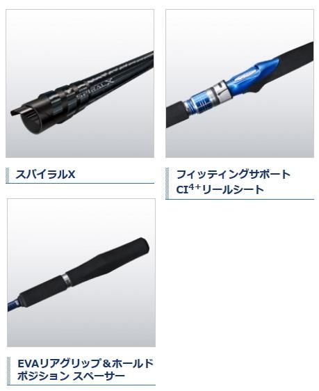 シマノ SHIMANO 海明[かいめい カイメイ KAIMEI] 船竿 ボートロッド ダブルX構造で快適な操作性を追求。 日本各地の多彩な対象魚や釣法に対応する、7:3調子オールラウンドロッド。 ネジレに強い[スパイラルX+ハイパワーX]のダブルX構造をカーボンブランクスに採用。ネジレを制御することで、誘いやアワセ、やり取りなどの一連のアクションが軽快に操作できます。また、ネジレによるブランクスのブレを追放することで、穂先で捉えたわずかなアタリもダイレクトに手元まで伝達する高感度設計に仕上げました。 ■軽さとパワーのベストバランスを追求、ネジレに強い「スパイラルX」 ■ネジレに強い強化構造「ハイパワーX」 ■チューブラー穂先 / グラスソリッド穂先(Sモデル) ■軽量でフィット感に優れた「フィッティングサポート18CI4+」リールシート ■オールSiCガイド ■軽量で操作性に優れた形状のEVAグリップ ■ホールドポジション スペーサー ■発売年:2018年
