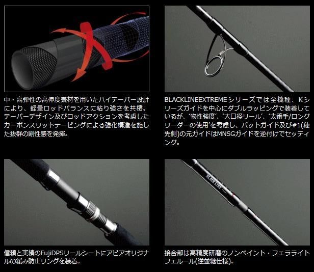 アピア (APIA) Foojin ブラックライン エクストリーム ルアーロッド ルアー竿 ショアジギングロッド ブリ・ヒラマサ・カンパチに代表される最もパワフルでアグレッシブなターゲット、青物。 「ブラックライン エクストリーム」は彼らに対して、磯をはじめとする ショアからのアプローチにこだわり、ハイパワーなブランク特性と高い剛性感を纏っている。 ロッドのパワー不足こそストレスと疲労感に繋がるケースも少なくないことを 知っているアピアが贈る、‘獲る’ための本質的な要素を徹底的に追求した超実践的モデルである。