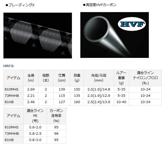 ダイワ DAIWA / グローブライド HRF (R) (スピニングモデル) ブレーディングX搭載。ソイ・アイナメをターゲットに調子を磨いた専用モデル ダイワが提唱するストイックなロックフィッシュ専用ブランド「HRF(ハードロックフィッシュ)」が最新テクノロジーを身にまとって復活。 ■810MHS(スピニングモデル) トーナメントから生まれたロングスピニング釣法対応モデル。ショアからライトリグをできるだけ遠投し、ベイトタックルではアプローチ不可能な未開拓エリアを攻めるためのロッド。1オンスのテキサスリグでも快適に扱える操作性、ターゲットに主導権を与えないパワーを秘める。 ■発売年:2016年