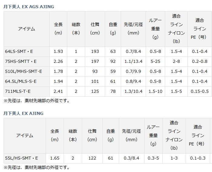 ダイワ 月下美人 GEKKABIJIN EX AGS AJING / EX AJING DAIWA グローブライド ソルトウォータールアー ショアロッド アジングロッド AGS搭載、ダイワアジングロッドの最高峰 アジングにおける無上の喜びは微かなアタリをモノにしていく玄妙さにある。アジをメインターゲットとするこの釣りは、ジグヘッドのウエイトが1グラム前後。数あるソルトルアーゲームの中で最も繊細なジャンルといえる。アタリが感じられないことには何も始まらない。すなわちロッドに求められるのは究極の感度。加えて視覚が制限されるナイトゲームが主体とくれば、指先に伝わる感度、すなわち「手感度」がいかに重要かが理解できる。EX AGS AJING/EX AJINGシリーズはSVF COMPILE-Xナノプラスのブランクに、ラインを通して確実にブランクに振動を伝える高感度・高剛性のAGS(エアガイドシステム)を搭載。テスターの感性を形に変えた究極のアジングシリーズ。 ■発売年:2018年