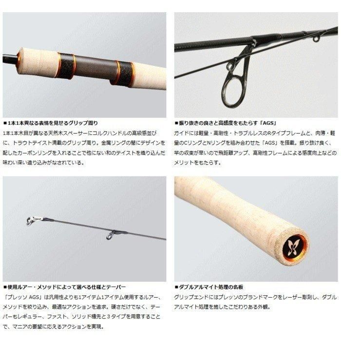 ダイワ グローブライド DAIWA PRESSO AGS トラウトテイスト溢れる外観にデザインを一新させたマニアに贈る本格的エリアロッド「PRESSO AGS」 競技志向の高いエリアマイスターのために使用ルアー・メソッドを絞り込みながら最適なアクションをダイワの最新カーボンテクノロジーを駆使して実現した本格的エリアロッドシリーズ。これまでのプレッソテイストは継続しながら、トラウト感溢れるロッドデザインに一新したハイエンドのネオスタンダードモデル。 ■発売年:2019年