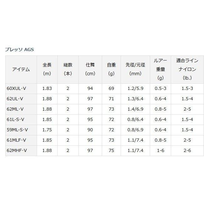 ダイワ グローブライド PRESSO AGS プレッソ AGS / トラウトロッド ルアーロッド エリアトラウト 渓流 管理釣り場 トラウトテイスト溢れる外観にデザインを一新させたマニアに贈る本格的エリアロッド「PRESSO AGS」 競技志向の高いエリアマイスターのために使用ルアー・メソッドを絞り込みながら最適なアクションをダイワの最新カーボンテクノロジーを駆使して実現した本格的エリアロッドシリーズ。これまでのプレッソテイストは継続しながら、トラウト感溢れるロッドデザインに一新したハイエンドのネオスタンダードモデル。