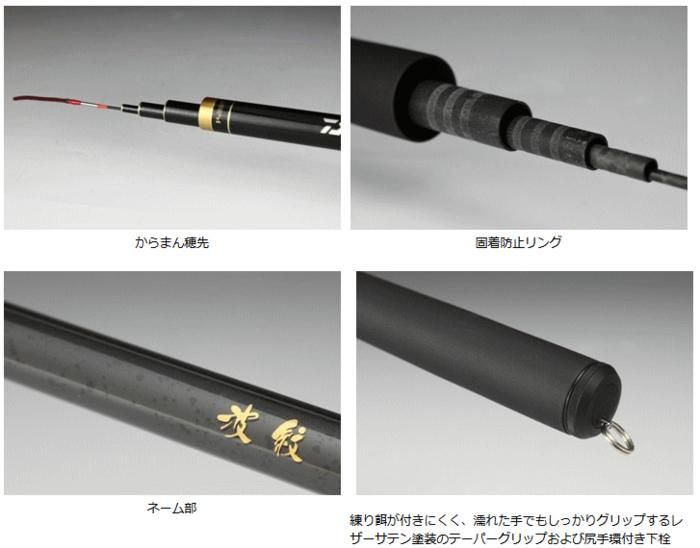 グローブライド ダイワ (DAIWA) 波紋J (HAMON J) / 鯉竿 / コイ竿 / へら竿 / ヘラ竿 / へらぶな用品 HVFカーボンを使用することでより軽量、シャープな振り心地を実現した振出竿。 V-ジョイントの搭載でしなやかな曲がりとパワーアップを両立。 硬調はスタンダードなへら・コイ用、超硬はパワー溢れるコイ用として最適な調子。硬調16、超硬13・16が新たに加わったニューラインナップ。