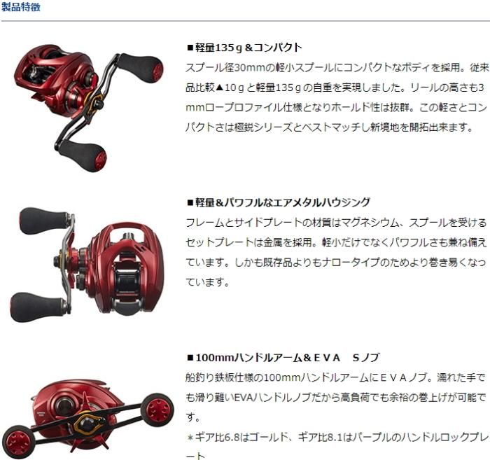 ダイワ グローブライド アドミラ DAIWA ADMIRA / リール ベイトリール 両軸リール 軽さを追及した新星「ADMIRA」軽さのアドバンテージは釣りを次のステージへと誘います。 ■軽量135g&コンパクト ■パワフルなエアメタルハウジング ■TWS(T-WING SYSTEM) [T-ウィングシステム] ■100mmハンドルアーム&EVA Sノブ ■UTD(アルティメットトーナメントドラグ) ■選べるギア比の展開 ・6.8(巻取り長さ64cm):カレイ、根魚等 魚が掛かった時のやり取りを楽に楽しむ方、とにかくパワフルな巻きを楽しみたい方へ ・8.1(巻取り長さ76cm):カワハギ、マルイカ等手返し重視の高速巻上げを楽しみたい方へ ■発売年:2019年