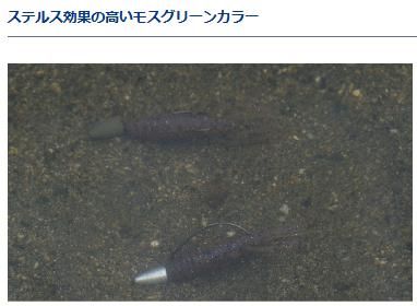 水中に同化することで、バスに気付かれにくいステルス性に富んだ塗装を施した。湖底にあわせたモスグリーンカラーのシンカーは、左写真を見て分かるように、通常のものよりシンカーが目立ちにくく、ワームだけが自ら泳いでいるように見える。