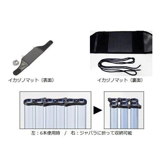 ダイワ DAIWA グローブライド イカヅノ投入器 ケース 携帯に便利な折たたみ式のイカヅノ投入器 6本組で、約1.6kg (8本組で、約2.1kg) 折り畳み可能なので収納も容易 付属品:イカヅノマット、スッテカー(2枚)、ヒモ2m (増設2本セットにはイカヅノマット・ステッカー・ヒモは付きません) ポリカーボネイト採用で、軽量化を実現。 透明なのでツノの配色確認、カンナの汚れ具合の確認が可能 折りたたみ可能でコンパクトに収納 2本単位で増設可能で、最小は4本でも使用可能