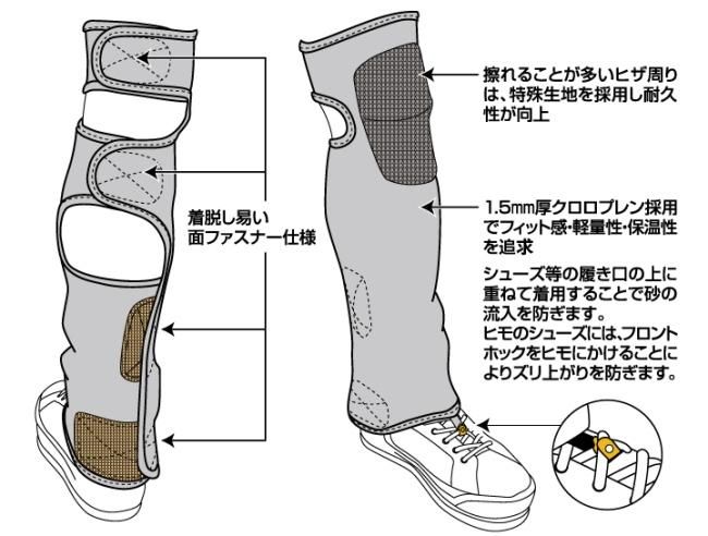 ヒザやスネを保護し、フィット感に優れて軽量。ヒザ周りは特殊生地を採用して耐久性を追求。