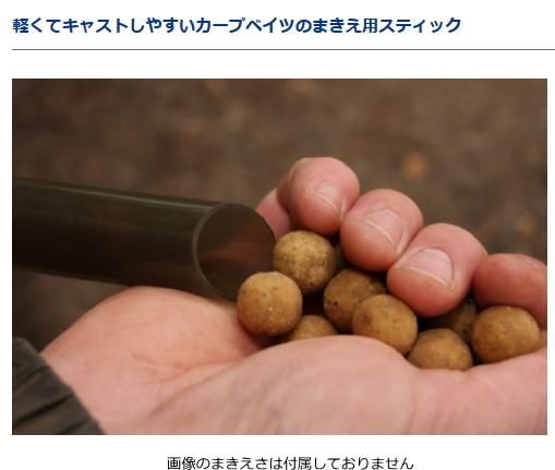 寄せエサとしてカープベイツをまく際に使用する専用スティック。カープベイツのサイズは20mmまでに適合。独特のJ型形状により放出時にカープベイツに回転の力がかかることでカープベイツが安定して飛んでいき、ポイントを的確に狙える。正しく使用した場合、慣れれば100mもの遠投が可能。
