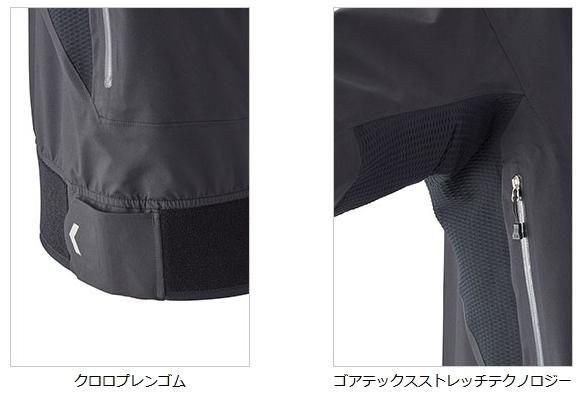 柔らかな着心地を実現したゴアテックス C-Knitバッカーテクノロジーを採用。運動量の多い可動域にはゴアテックス ストレッチテクノロジー素材を使用し挙動を妨げない設計。防水性とフィット感を高めた2重襟構造。ウエスト部には伸縮性のあるクロロプレンゴムを採用し、激しい動きの中でもズレや水の浸入を防止。ポケットには、水分の浸入を軽減する加工を施した軽量ファスナーを採用。フード部には、片手で素早く簡単にフィット感を調整可能なCohaerciveシステムを搭載。2重袖口内側には、伸縮性に優れフィット感の高い新素材を採用し袖口からの浸水を軽減。
