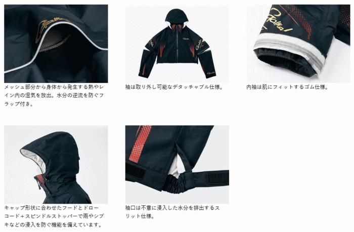 ●ウェダーとの組み合わせや立ち込みにも対応するショート丈タイプ。●フードは首裏に収納式。●胸の左右には止水ファスナーを配置。●ジャケットの脇にはオリジナル特殊裁断パターン( モーションリンクシステム)を採用し、釣り特有の身体の動きをサポートします。●ファスナー引手はつまみ易いオリジナル引手を採用。●袖口は面ファスナーを使用したサイドアジャストタブを採用。サイズを調整することで袖口からの雨の浸入を防ぎます。不意に浸入した水分を排出するスリット仕様。●袖はファスナーにより取り外しが可能なデタッチャブル仕様。天候や暑さに合わせて調節できます。●裾内側にスナップボタンを配置し、2 段階の丈の調整が可能。●背中にはベンチレーション機能を採用し、通気性を向上。メッシュ部分から身体から発生する熱やレイン内の湿気を放出し、快適な着心地を実現。●背中ベンチレーション部には再起反射のパイピングを採用し、夜間の視認性を向上。