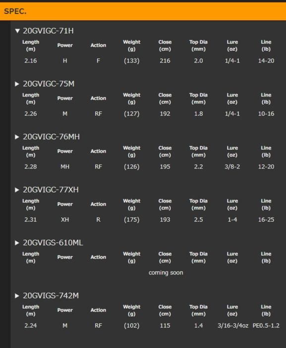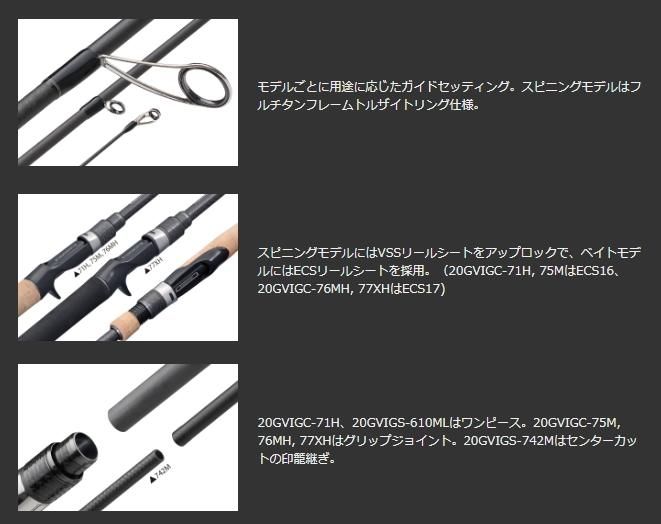 ●モデルごとに用途に応じたガイドセッティング。20GVIGC-75M、76MHはフルチタンフレームトルザイトリング仕様で、ストリッピングガイドにはラインの収束を助け飛距離を伸ばすためのLRVガイド、適所に感度と強度を両立するKWガイドを配置。ティップ方向にはシングルフットガイドを配置することでシャープな使用感に。