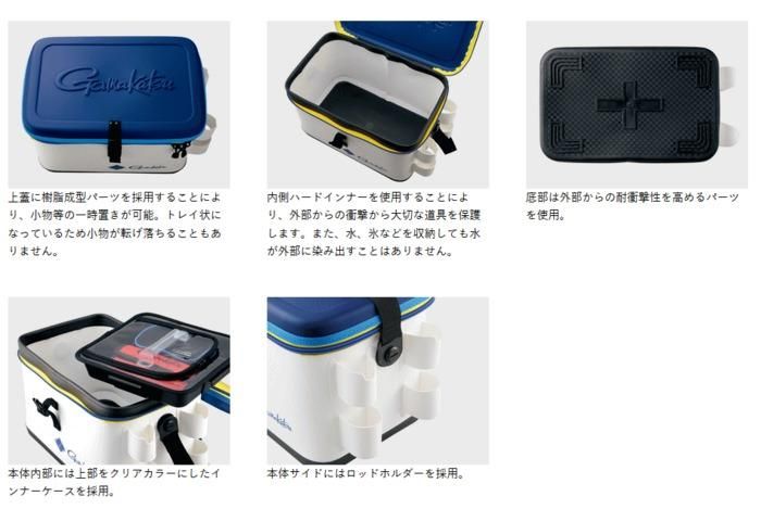 ●本体素材には耐光堅牢度に優れ、退色に強いE.V.Aシートを採用。●蓋部分はハードな成型蓋を使用。雨やシブキが浸入しにくく、汚れても拭き取りやすい形状です。●上蓋に樹脂成型パーツを採用することにより、小物等の一時置きが可能。トレイ状になっているため小物が転げ落ちることもありません。●ロッドホルダーを合計2本採用。少しの休憩や仕掛作りなどの時の仮置きに便利です。※竿を立てる際は本体の置き場や重量、風などに注意してください。バランスが崩れて転倒する恐れがあります。●本体内部には上部をクリアカラーにしたインナーケースを採用。バッカン自体を2層に分けることができ、収納力がアップします。●トレイの側面にはフックを取り付け本体口部分に3点で固定が可能。1点を外すと使いやすい位置にスライドすることが可能です。●洗いやすい内部鏡面仕上げ。●汚れが付きにくく洗い落としやすい内部。●本体サイドにはロッドホルダーを採用。●底部には滑り止めを採用。5点のパーツで接地面をグリップします。