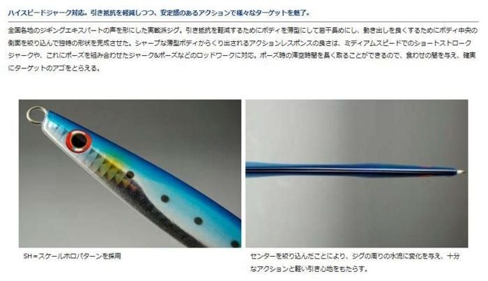 全国各地のジギングエキスパートの声を形にした実戦派ジグ。引き抵抗を軽減するためにボディを薄型にして若干長めにし、動き出しを良くするためにボディ中央の側面を絞り込んで独特の形状を完成させた。シャープな薄型ボディからくり出されるアクションレスポンスの良さは、ミディアムスピードでのショートストロークジャークや、これにポーズを組み合わせたジャーク&ポーズなどのロッドワークに対応。ポーズ時の滞空時間を長く取ることができるので、食わせの間を与え、確実にターゲットのアゴをとらえる。