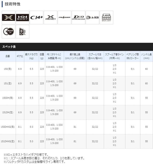 ■バルケッタFカスタムは上位機種バルケッタプレミアムからHAGANE ボディやXプロテクトなどコアなフィーチャーを受け継ぎながら、素材、パーツ等を見直すことで30g以上の軽量化を果たしたフォールレバー搭載の最軽量モデル。スローフォールが有効な釣り全般をカバーしますが、特にギア比8.1のDHXGモデルはメタルスッテに好適。DHモデルはギア比6.9のダブルハンドルで、鯛ラバなどテクニカル系の釣りに。ノーマルモデルはギア比6.9のシングルハンドルでヒラメやライトジギングなどパワー系の釣りにマッチします。