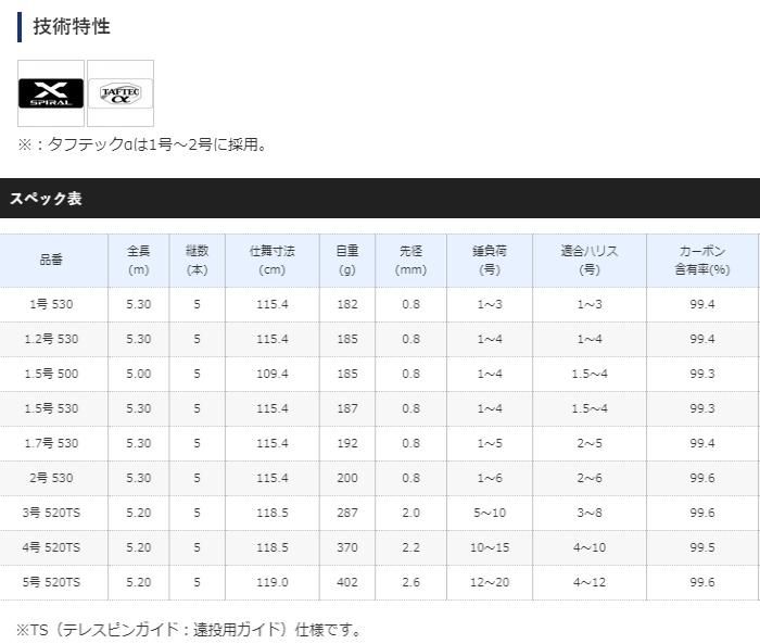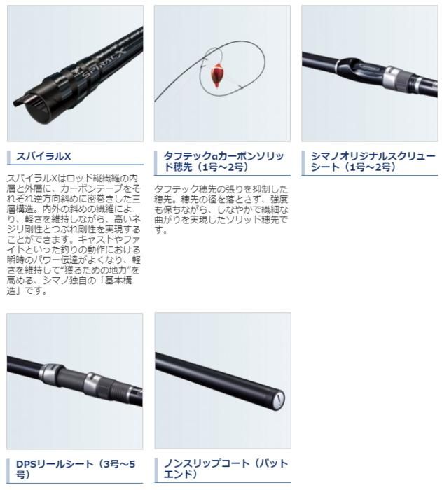 ●スパイラルXを搭載したブランクスにより、ひとクラス上のモデル、ラディックスに肉薄する基本性能を獲得。しっかりとポイントを撃ち、掛けた魚はロッドを曲げ込むことで素早く浮かせます。またこのクラスにおいても確実にリールをホールドするシマノオリジナルスクリューシートを採用。握り込みやすく、安定したやり取りが可能です。タフテックα採用で黒鯛や防波堤のグレに適した1号から、大型青物を射程にするチューブラー穂先の5号遠投仕様まで充実の布陣です。