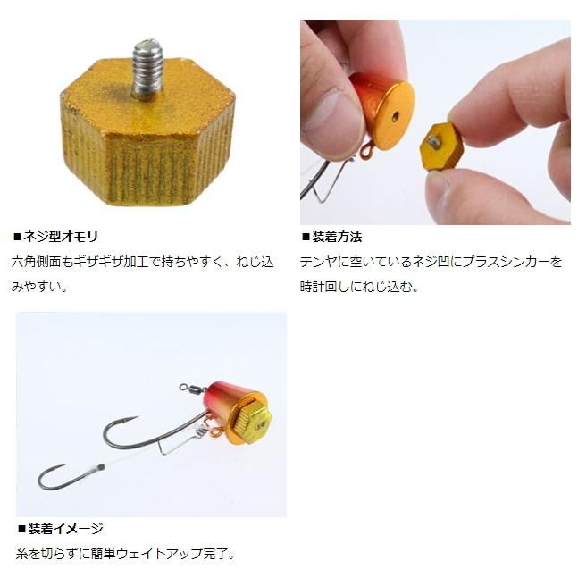 ■ダイワ紅牙タイテンヤシリーズに取り付けることが出来るウェイトアップパーツ。ひとつテンヤ釣法において潮流や水深に応じてテンヤの号数を切り替えるシーンに大変便利なアイテムになります。ネジ式のシンカーをテンヤ・カブラ・遊動テンヤにネジ込むだけで1〜2号まで簡単ウェイトアップが可能。地合を逃したくない!テンヤを結び直す時間が惜しい!そんなシーンで大活躍します。