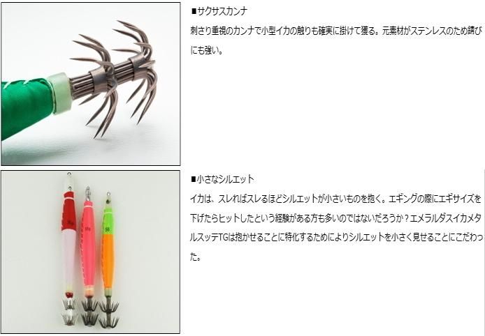 イカは、スレればスレるほどシルエットが小さいものを抱く傾向がある。エギングの際にエギサイズを下げたらヒットしたという経験がある方も多いのではなかろうか。「エメラルダス イカメタルスッテ TG SS」は、イカに抱かせることに特化するためによりシルエットを小さく見せることにこだわったタングステンスッテ。また、イカはストンと垂直に落ちるものよりも水平に落ちていくものにより反応すると一般的に言われていることから、単純なフォールスピードよりもフォール姿勢を重視。ローライトコンディションでの必須カラーである夜光下地と、「ミッドスッテMETAL」で実績のある夜光スレッドを全カラーに採用。カンナは「サクッと刺さる」フッキング率の高さで定評のあるSaqSas(サクサス)仕様、かつ水平フォールのバランスを取りやすいように最適なカンナをセレクト。ルアー的な要素が強いイカメタルゲームにおいて、ライバルに差をつけられる要素を満載したこだわりの専用スッテに仕上がっている。