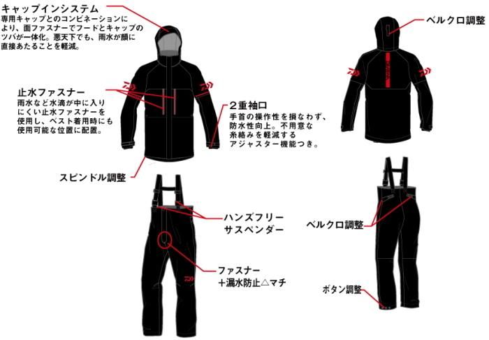 ■汚れが付き難く、耐久性に優れたポリ塩化ビニル防水素材採用。左右胸ポケットに、軽量化・ゴワツキ軽減に役立つ止水ファスナー搭載。面ファスナーでウエストサイズの調整が可能なウエストアジャスター。防水性に優れた2重袖口、チェストハイ仕様。着用時の汚れやメンテナンス時の扱いを気にすること無く、釣りに集中できるタフさを持つ。