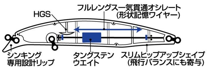 好評の「Z97F」のシンキングバージョン。リップを専用設計し、当然HGSを搭載することで、アベレージ65.6m、MAX67mというキャスタビリティに加え、水面下約50〜100cmのレンジをしっかりとキープできる性能を持たせた。主戦場は河川やベイエリア、足場の高い場所、ボートゲームなど。そんなポイントで勝利を呼び込むために、足元まできっちり引けてバイトゾーンが長く取れる、「最後にリールハンドル2巻きのアドバンテージを与えてくれる」ミノーである。