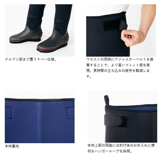 ●4mm厚のクロロプレーンを採用することにより、立ち込んだ際にも体をしっかりと保温します。また、クロロプレーンの伸縮性は釣行時に発生する、ポイント移動時の歩行運動、オトリ交換の際の屈伸運動などの動作を妨げません。●立ち込み時の上部からの水の浸入を防ぐチェストハイを採用。●独自の立体裁断を採用し、さらにウエストの両側にアジャスターベルトを装着することで、より高いフィット感を実現。長時間の立ち込みの疲労を軽減します。●生地の接合部分を減少させ、ストレッチ性能を最大限に発揮するパターンを採用。●タビ部分は石などの外部からの衝撃や針先などでの本体の損傷を防ぐラバーガード仕様。●本体上部の両脇に釣行後のお手入れに便利なハンガーループを採用。