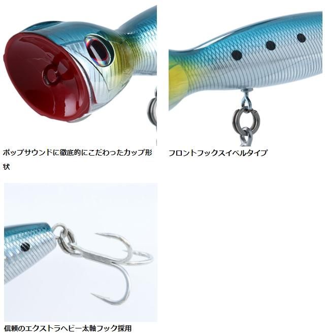 ■日本でデザインされ、海外で絶大な支持を得た”MEBACHI POPPER”をベースに日本向けにチューンナップ。 ヘッドに配したストリームコントロールフィンとリアに集中的にウエイトを配したバランスデザインで安定した飛び姿勢による驚きの飛距離を実現。 幾度と無く試行錯誤を重ねたカップ形状と浮き姿勢でポッピングコントロールも意のまま。 ショートジャークでもロングジャークでも思ったとおりのアクションを生み出します。 また、ダイビングシーンではヘッドの後部分のクビレが、水流を生み、魅惑のウオブリングでターゲットを魅了します。 ホログラムはカラーバランスを考慮し、厳選されたホロパターンをチョイス。 フックは錆に強いTINメッキ仕様ヘビーシャンクワイヤーを採用。不意の大物にも十分な強度を発揮。 フロントフックアイは、スイベル仕様で船べりでの攻防戦においてのアドバンテージを約束します。