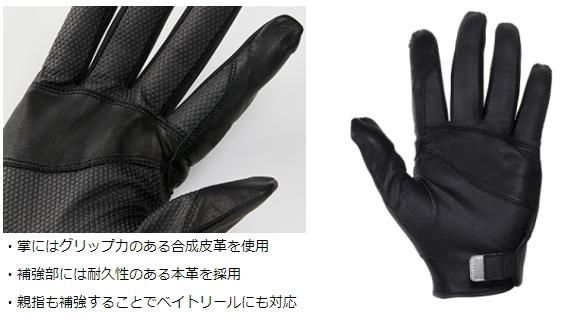 タイタニュームα(TM)使用。耐久性に優れるグリップ素材と本革補強つきジギンググローブ