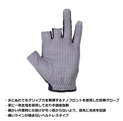 水に濡れてもグリップ力を発揮するナノフロント®を使用した防寒グローブ。掌に一枚生地を使用しており手感度抜群。細かい作業時に仕掛けが引っ掛からないよう、指先に合皮を配置。細いラインが絡まないベルトレスタイプ。