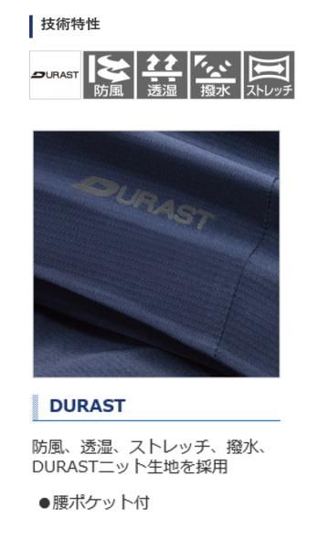 防風、透湿、ストレッチ、撥水、DURASTニット生地を採用