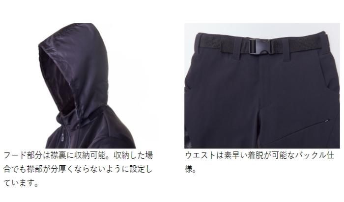 ●【ジャケット】軽量で高いストレッチ性能を持った素材を採用し、人間の動作で発生する様々な動きに対応します。防風性能に優れ、少し肌寒い時期や風が強い場所では強い味方になります。本体自体に撥水加工をしており、瀬渡し中の水シブキや小雨を簡易にしのぐことが可能。不意に付いたコマセもはらうことができます(防水仕様ではありません)。フード部分は襟裏に収納可能。重ね着をする場合やフードのバタつきが気になる際は収納し、瀬渡し中の水シブキや雨をしのぐ時には外に出して着用できます。収納した場合でも襟部が分厚くならないように設定。袖口はバインダー仕様で手首に優しくフィットし、重ね着をした際にもごわつきません。首元をファスナースライダーから守るチンガードを採用。両腰に各1か所ファスナー付きポケットを装備しました。