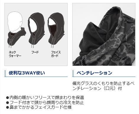 フード付きで頭から顔周りの冷えを防止フェイスガード