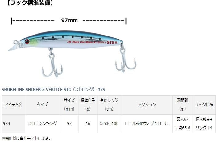 ■「ショアラインシャイナーZ バーティスSTG97S」は、河川、足場の高いエリア、ボートゲーム等に最適な「ショアラインシャイナーZ 97S」をベースに、食い渋りのヒラスズキやランカーシーバス、青物、マダイ狙いに特化した、極太軸フック&大型リング搭載の大型魚専用小型スローシンキングミノーです。