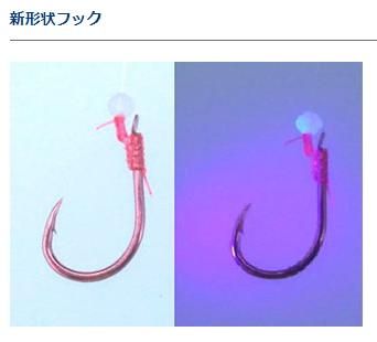 ・形状は青物も視野に入れえ開発したD-MAX尾長真鯛を採用。小ぶりであるが軸が長くなりオキアミがつけやすいシャンク形状。また、特殊製法により十分な針強度持った新フック。さらに、オキアミのカラーに溶け込むステルスカラーピンク。表面にケイムラ加工をプラス、紫外線で青白く光るのでワラサに高アピール。