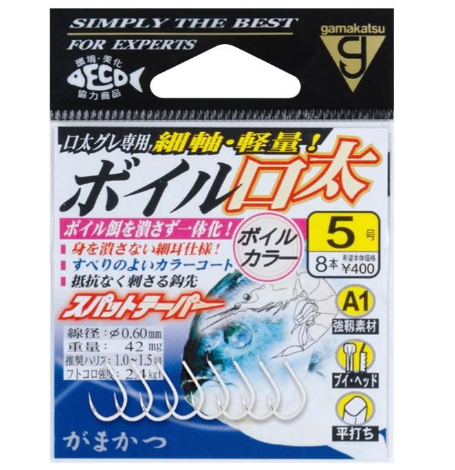 すべりがよく餌と一体化するボイルカラー、スッと刺さりこむスパットテーパー鈎先、身を潰さない細軸仕様など、オキアミボイルの型を崩さない工夫が満載!スレた中・大型口太グレも警戒なく、くわえ込む軽量設計。