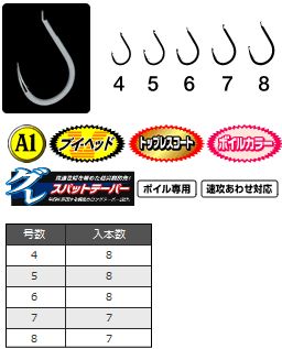 広めに設定されたフトコロ幅と鈎先角度が魚へのコンタクト性を高め、ストレート気味の鈎先がそのコンタクトを一瞬で捕らえる「速攻あわせ」に対応。高強度・高靭性かつ耐摩耗性に優れた「A1素材」採用、鈎先の鋭さを維持します。