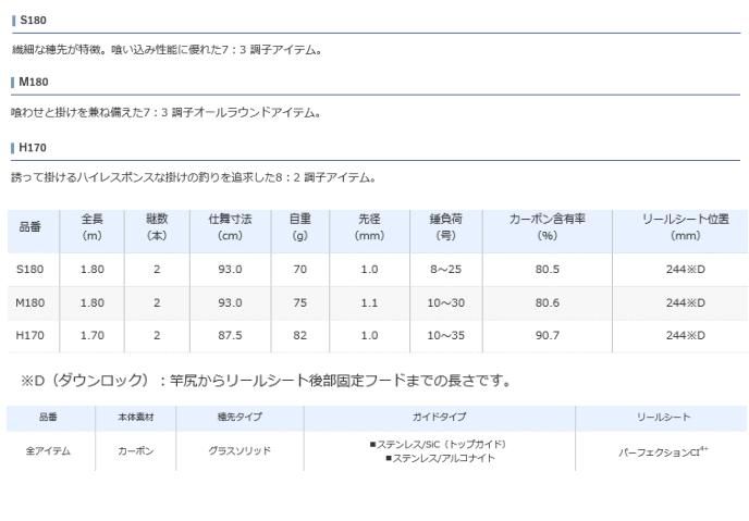 ブランクスには、軽量でネジレに強いスパイラルXを採用。軽快な誘い操作とアンダーキャストでの遠投が可能になりました。リールシートはキャストや誘いの際に感じる疲労感を軽減するパーフェクションシートCI4+をダウンロックで搭載。繊細に喰わせるS180、オールラウンダーのM180、ハイレスポンスな掛けアイテムH170。3つの個性で船のキス釣りにおける、多様なシチュエーションに対応します。