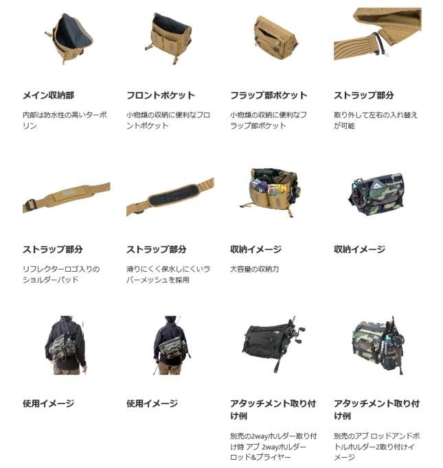 ●高い収納力と別売りアタッチメントで拡張可能なメッセンジャー型フィッシングバッグ。タウンユースでも違和感無く使えるデザイン性の高さと、本格的なフィッシングスタイルに対応した拡張性も備えています。